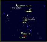 You'll rendezvous with two Rapiers, Foxtrot Wing, from the Kyoto, here. From this point, you'll proceed to Nav 1 skirting the edge of an asteroid field. Then you'll head on to Nav 2, the last reported position of the Fralthi. She can't be far from this point, and she's an awfully big bogey. You shouldn't have any trouble finding her.