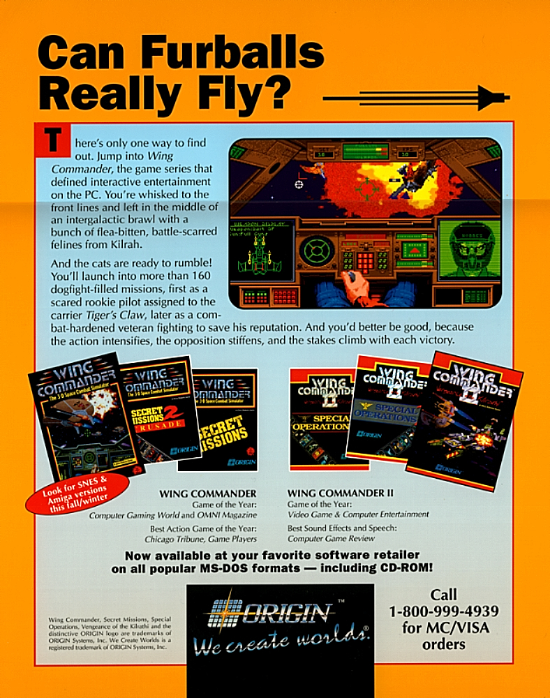 1992 Computer Gaming World magazine advertisement, promoting the then-complete series of Wing Commander, The Secret Missions, Wing Commander II: Vengeance of the Kilrathi, and Special Operations.
