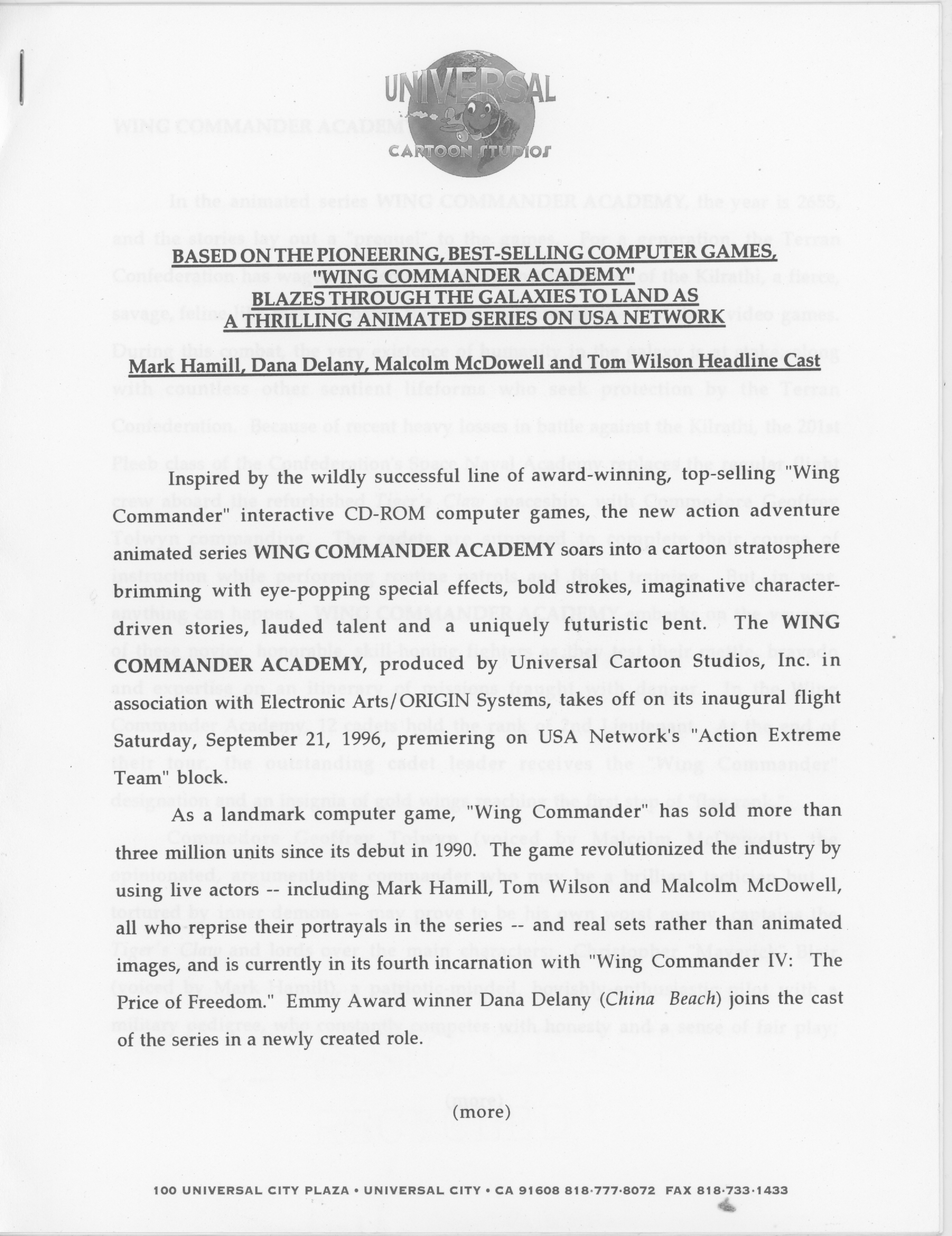 Wing Commander Academy - Press Kit - Press Release Cover