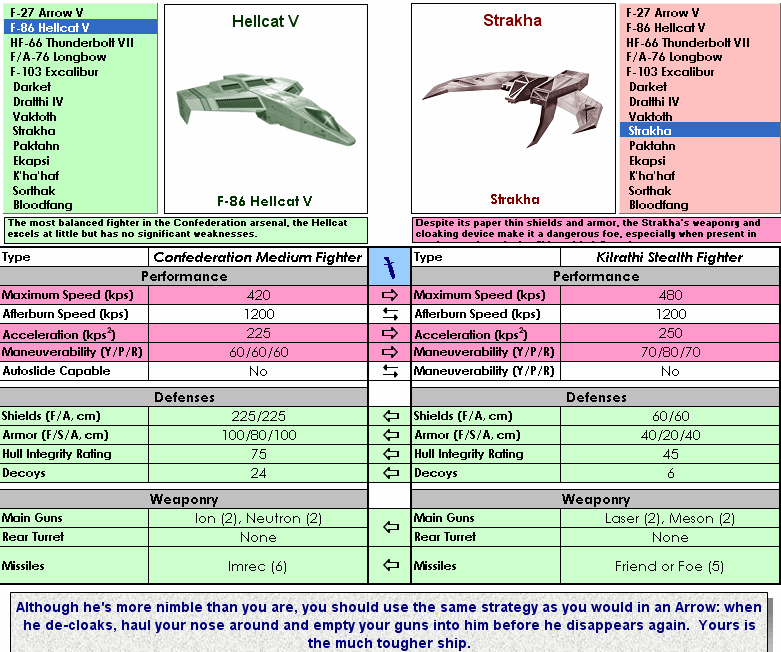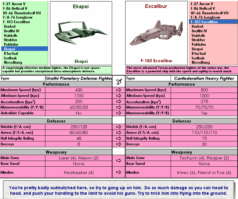 I have a little fan project I've been working on that I wanted to share with the community. Some time back, as you may recall, I was working on a Wing Commander ship comparer built in Microsoft Excel, that hearkens back to the old glory days of combat simulators--the great old game Chuck Yeager's Air Combat. That game included a fighter comparer that allowed you to put two fighters side by side, compare their stats, and get some sage advice from Yeager himself on how to win an encounter. I built something similar to that for WC1, but never finished it due to difficulties in determining exactly what the specific ship stats actually were.